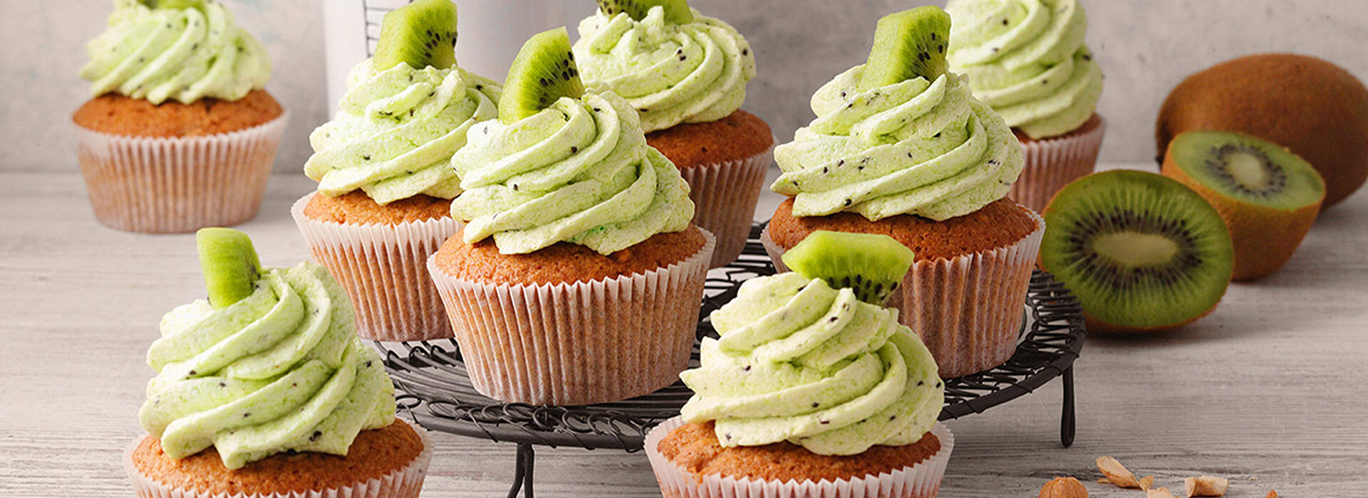Dabei sind Kiwis in der Küche gar nicht so unkompliziert: Roh verwendet reagieren sie durch ein natürlich enthaltenes Enzym mit vielen Milchprodukten wie Sahne, Quark oder Joghurt und machen diese in kurzer Zeit unangenehm bitter. Mit Butter hingegen geschieht dies nicht, daher kannst du die Kiwi-Buttercreme für das Frosting auch gut vorbereiten und die getoppten Cupcakes ein bis zwei Tage gekühlt aufbewahren.