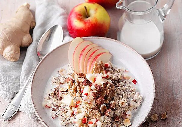 Haferbrei ist denkbar unkompliziert und daher gerade für das Frühstück, wo es oft schnell gehen muss, enorm beliebt: Für Bircher Müsli oder Overnight Oats (mit Pflanzendrink statt Kuhmilch wird unser Rezept vegan) werden einfach Haferflocken mit etwas Zucker, unterschiedlichen Kernen, Saaten oder gehackten Nüssen sowie Flüssigkeit gemischt und quellen über Nacht im Kühlschrank. Dadurch wird das Ganze nicht nur lecker cremig, das Einweichen sorgt auch dafür, dass die im Hafer befindliche Phytinsäure abgebaut wird und unser Körper die ebenfalls enthaltenen Mineralstoffe besser verarbeiten kann.