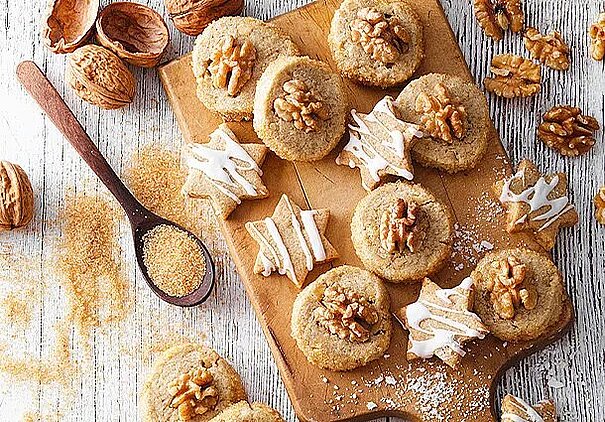 In amerikanischen Backstuben und Haushalten sind Kekse - dort unter dem Titel Cookies - von der Rolle häufig anzutreffen, oft sogar das ganze Jahr über: Sie lassen sich großartig und schnell vorbereiten und warten dann im Kühl- oder Gefrierschrank auf ihren Einsatz. Klassische Mürbeteige eignen sich für diese Zubereitung ganz besonders gut: Sie werden nach dem Kneten zu Rollen geformt, in Backpapier, Bienenwachstücher oder Folie gewickelt und kalt gestellt, bis der Teig fest wird. Unser Rezept für Walnusssterne und -taler beweist, dass sich so mancher Teig für Ausstechkekse mit dieser Methode beschleunigen lässt.