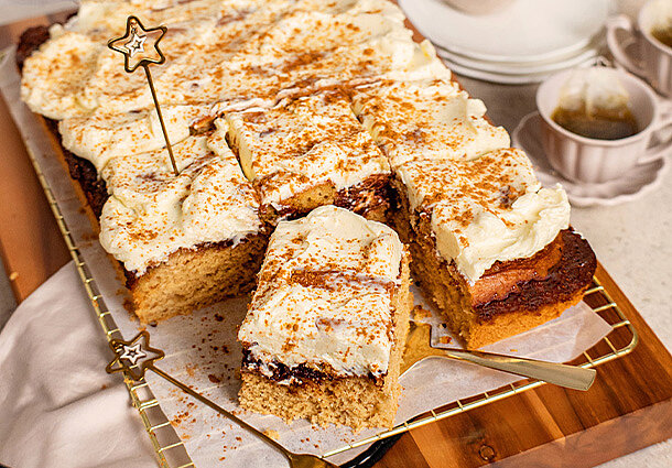 3. Frischkäse mit Butter, Vanille und Bio-Puderzucker verrühren. Auf den Kuchen streichen. Zimt und Braunen Bio-Zucker mischen, Kuchen damit bestreuen. Kuchen servieren oder kühl stellen.