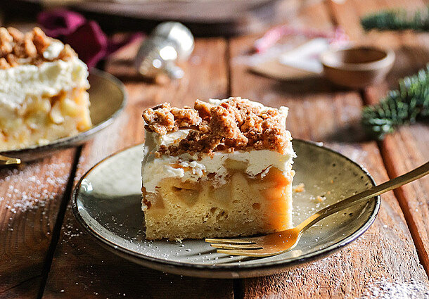 2. Backofen auf 175 °C Ober-/Unterhitze (155 °C Umluft) vorheizen. Butter und Braunen Bio-Zucker cremig rühren. Eier einzeln zufügen und kurz unterrühren. Joghurt zugeben und vermengen. Mehl, Backpulver und Salz mischen und kurz unterrühren. In eine gefettete rechteckige Kuchenform (ca. 25 x 38 cm) füllen und glatt streichen. Äpfel auf dem Teig verteilen und Kuchen im heißen Ofen ca. 45-50 Minuten backen.