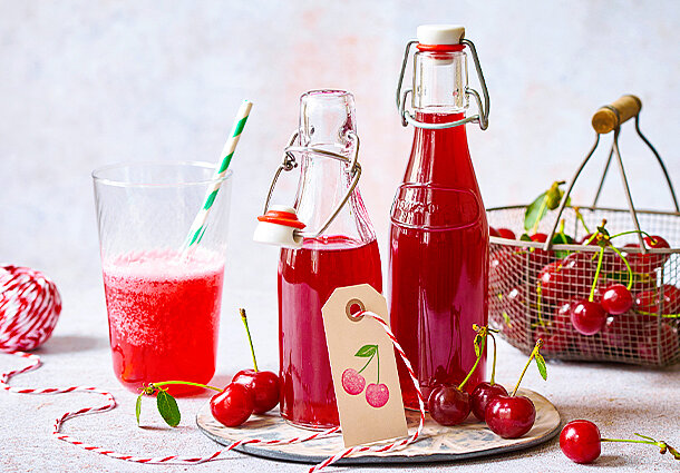Kirschen waschen und entstielen. Mit 500 ml Wasser aufkochen und ca. 5 Minuten garen, bis sie zerfallen, dabei mit einem Kartoffelstampfer leicht zerdrücken. Ein Safttuch in ein Sieb legen und eine Schüssel darunter stellen. Kirschen darauf geben, Saft abtropfen und abkühlen lassen. Reste im Tuch gut ausdrücken.