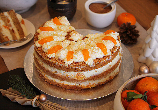 4. Für die Füllung den ersten Boden auf eine Platte legen, mit etwas Milch beträufeln, mit Hälfte Aprikosenmarmelade bestreichen. Hälfte der Mandarinen darauf verteilen. 1/3 Mascarponecreme darüberstreichen. Zweiten Boden auflegen, Vorgang wiederholen. Dritten Boden auflegen. Torte mindestens 30 Minuten kühl stellen.